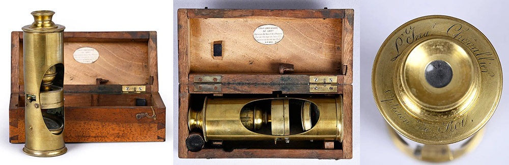 Another “Selligue”-type microscope. The label pasted in the case reads “L’Ing Chevallier Opticien du Roi et des Princes vis-à-vis le Marché aux Fleurs No1 à Paris”. As above, it dates between ca. 1825 and 1842. Adapted for nonprofit, educational purposes from http://www.niepce-daguerre.com/Vincent_et_C_Chevalier.html.