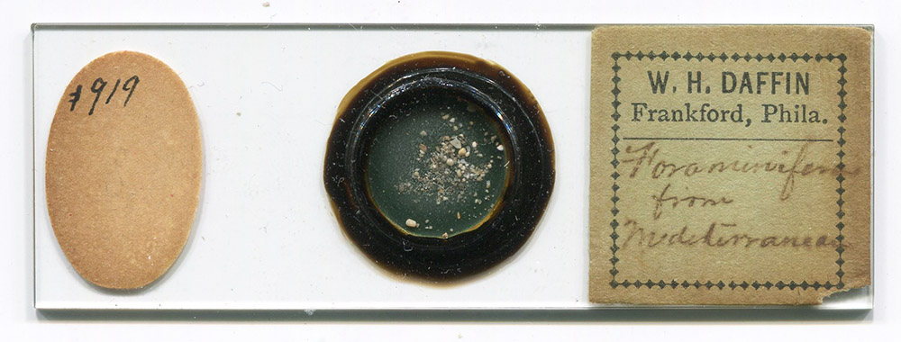 Dry-mount of “Foraminifera from Mediterranean”, prepared ca. 1875 by W.H. Daffin (see Figure 1). Imaged with a 3.5x objective lens and C-mounted digital SLR camera on a Leitz Ortholux II microscope, with lighting from above.