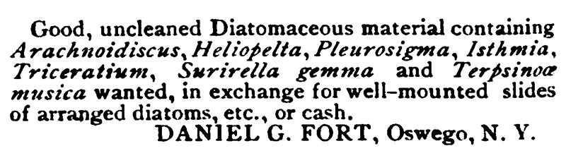 Daniel Fort advertised to exchange his “well-mounted slides of arranged diatoms” for raw material, during 1881 and 1882. From “The American Monthly Microscopical Journal”, 1882.