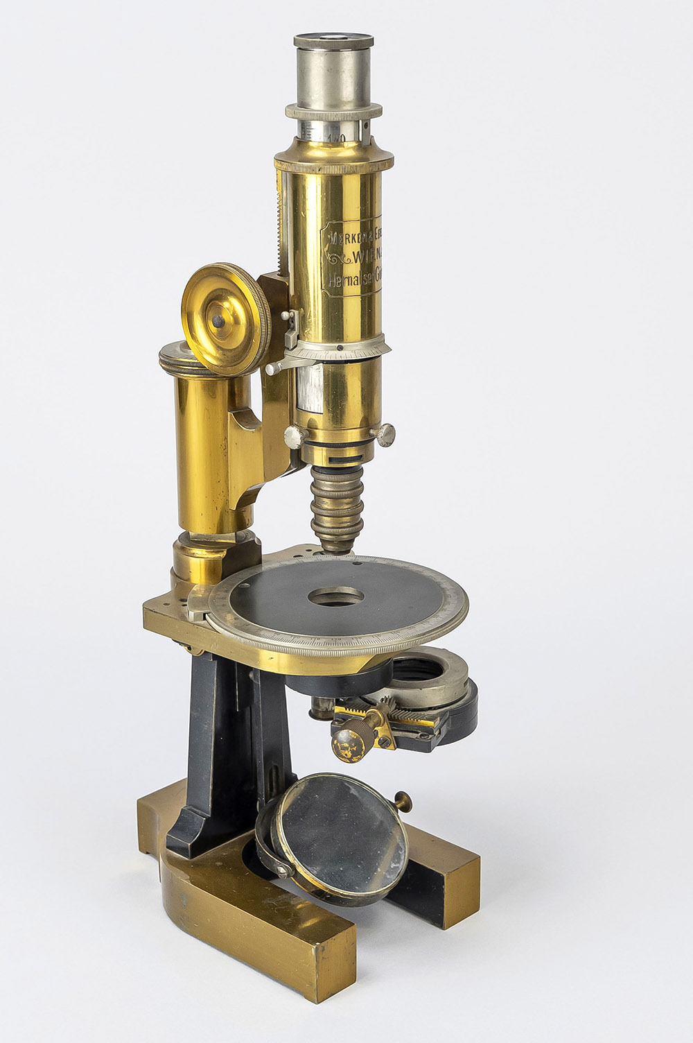 A surviving Merker microscope, of the same pattern as illustrated in Figures 1-5. It is engraved with serial number 3187. The address of Buchfeldgasse 19 dates its production to between 1893 and ca. 1900. Adapted for nonprofit, educational purposes from an internet sale site.