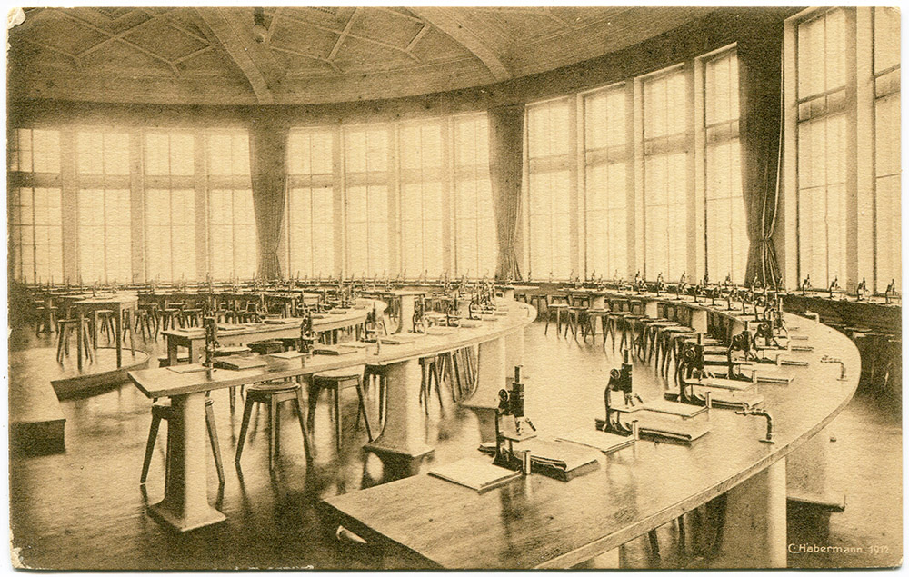 Microscope room, Munich, on a 1913 post card. Note that the semicircular tables all face the round wall of windows, giving each microscope abundant light for its mirror.