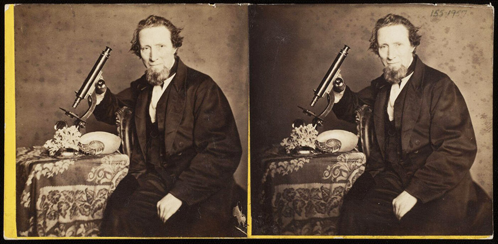 Stereoview of a man with a microscope, shells and coral, undated. From https://collections.vam.ac.uk/item/O1044753/stereograph-portrait-of-a-man-photograph/ .