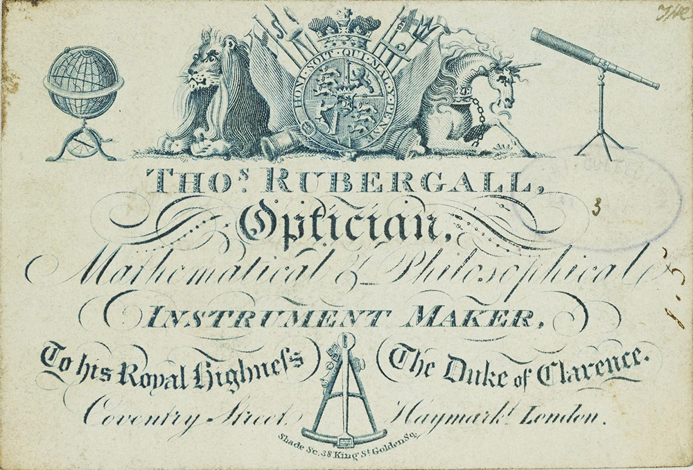 Early trade label of Thomas Rubergall. The Duke of Clarence was the future King William IV, who ascended to the throne in 1830. An 1840 receipt that is held in the National Library of Ireland described Rubergall as “Optician to His Majesty” (i.e. King William IV). A trade card from Rubergall’s successors, Bithray & Steane, states that Rubergall was “Optician to the Queen” (i.e. Queen Victoria). Adapted for nonprofit, educational purposes from https://collection.sciencemuseumgroup.org.uk/objects/co8002250/trade-card-thomas-rubergall .