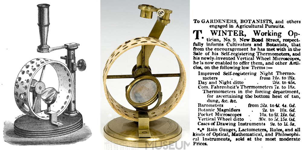 (Left) Illustration of a compound “vertical wheel microscope”, engraved “Thomas Rubergall, Optician to H.R.H. the Duke of Clarence, 24, Coventry Street, London”, from “The Journal of the Royal Microscopical Society”, 1884. (Center) A simple version of the same microscope that bears “T. Winter, No. 9, New Bond Street, London”. Adapted for nonprofit educational purposes from the Oxford Museum of the History of Science. (Right) An 1827 advertisement from Winter - note that he described the vertical wheel microscope as "newly-invented". In 1884, Thomas Phillips Harris, owner of the T. Harris & Son optical and scientific business, wrote, “Thomas Winter was the ‘first and true inventor’ of these instruments … Winter worked for Mr. Harris, and sold the first model to him. Later Winter made some for Rubergall, probably the compound one. He also made some much smaller ones, which were sold for a few shillings.”