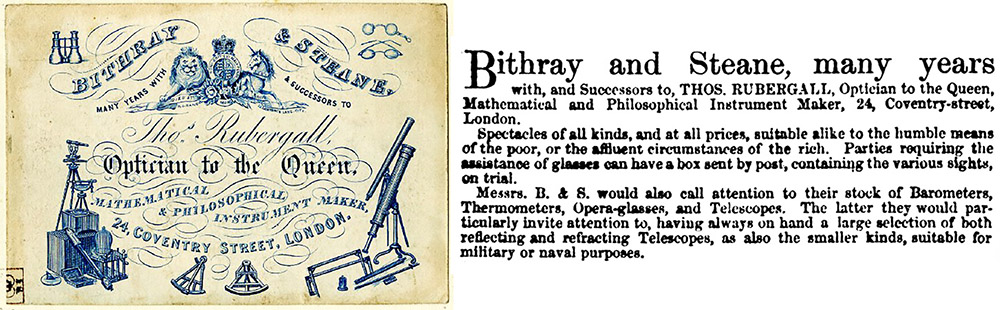 William Bithray (1816-1855) and Thomas Steane (1825-1886) worked for Thomas Rubergall for for over 15 years, and formed a partnership to continue the business at 24 Coventry Street as "Bithray and Steane". Their trade card was based on Rubergall’s (see Figure 1, above). An 1855 advertisement from “The Lancet” (right) states that they sold spectacles, barometers, thermometers, telescopes, and opera-glasses (which were usually small binoculars). The business lasted only a year or so, between the time of Rubergall’s death (1854) until shortly after Bithray’s death in January, 1855. Left image adapted for nonprofit, educational purposes from an image made available by The British Museum.