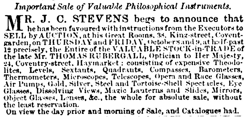 Bithray and Steane either did not acquire all of Rubergall’s inventory, or it was re-sold after their partnership ended. In October, 1863, J.C. Stevens auction house sold ”the Entire of the Valuable Stock-in-Trade the late Mr. Thomas Rubergall, Optician to Her Majesty, 24 Coventry-street, Haymarket: consisting of expensive Theodolites, Levels, Sextants, Quadrants, Compasses. Barometers. Thermometers, Microscopes, Telescopes, Opera and Race Glasses, Air Pumps, Gold, Silver, Steel and Tortoise-shell Spectacles, Eye-Glasses. Dissolving Views, Magic Lanterns and Slides, Mirrors, Object Glasses, Lenses, &c.” (Figure 15).