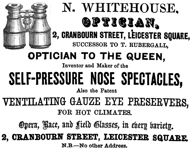 Post Office Directory of London (1851) “Rubergall Thomas, optician to her Majesty, 24 Coventry street, Haymarket”, page 962