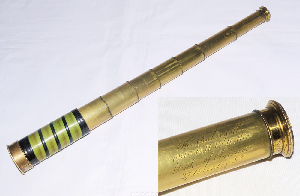A telescope engraved “Thos Rubergall, Optician to H.R.H. the Duke of Clarence, 27 Coventry St., London”, dating it to ca. 1820. Adapted for nonprofit, educational purposes from an internet sale site.