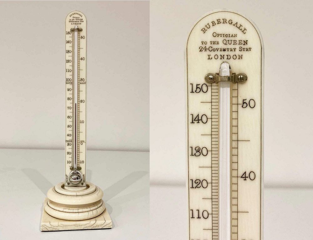An ivory thermometer marked “Rubergall, Optician to the Queen, 24 Coventry Strt, London”. Adapted for nonprofit, educational purposes from an internet sale site.