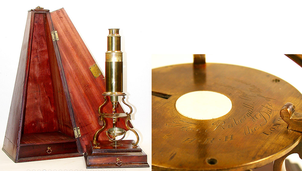 Culpeper-type microscope, signed “Thos. Rubergall Opticians to H.R.H. the Duke of Clarence, London”. The signature dates it to before 1830, when the Duke became King William IV. It may have been produced for the wholesale trade by a large-scale manufacturer such as G. & W. Proctor of Sheffield (see Figure 9). Adapted for nonprofit, educational purposes from an internet sale site.