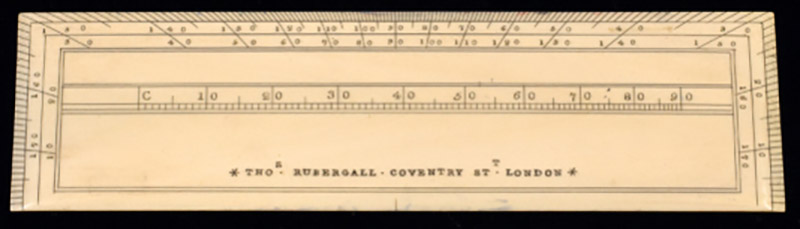 An ivory ruler marked “Thos. Rubergall, Coventry Stt, London”. Adapted for nonprofit, educational purposes from an internet sale site.