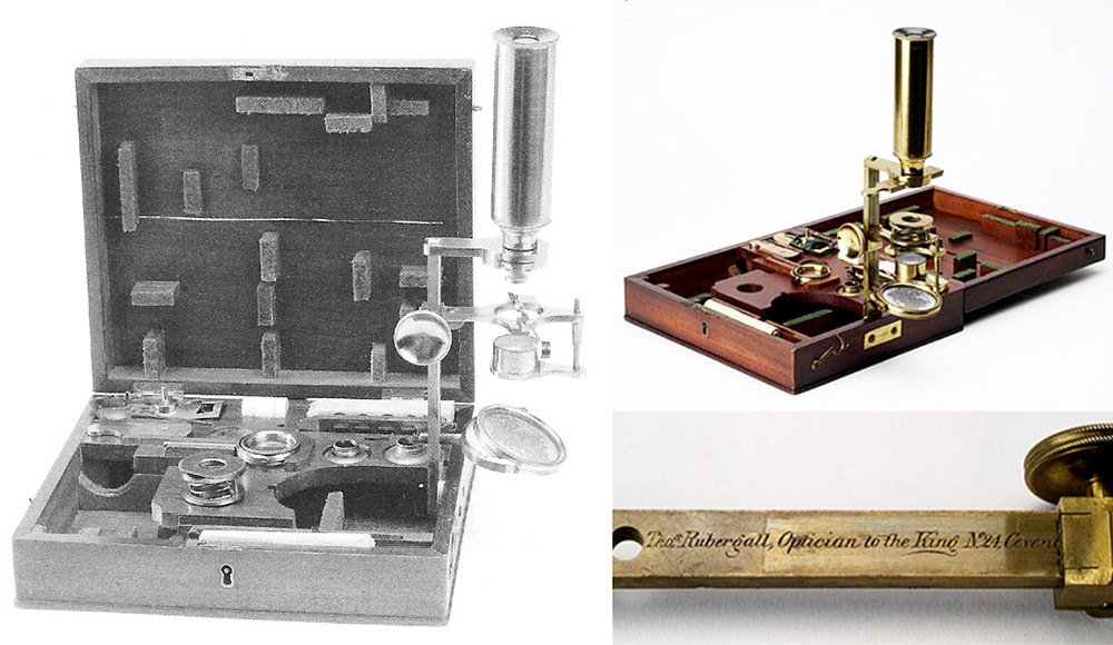 A case-mounted microscope, signed “Thos. Rubergall 27 Coventry St.”. The address dates it to before 1823-1830. Adapted by permission from http://www.antique-microscopes.com/photos/Rubergall.htm .