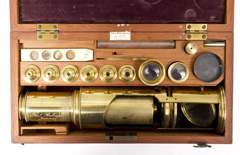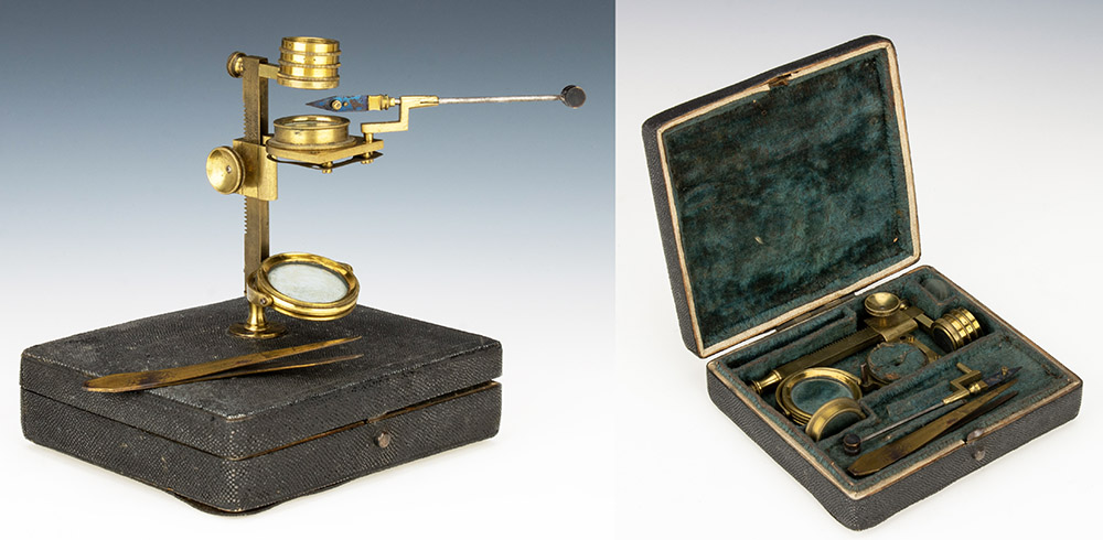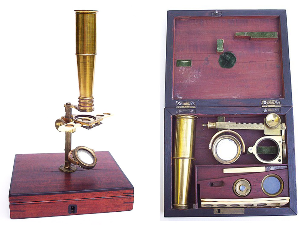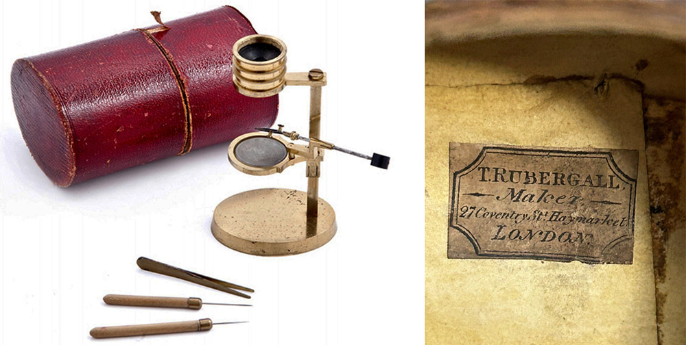 A small “botanical” microscope, with a label inside the case that reads, “T. Rubergall – Maker - 27 Coventry St. Haymarket, London”. The address dates it to before 1823-1830. Adapted for nonprofit, educational purposes from an internet sale site.