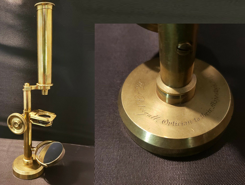 Compound microscope, signed “Thos Rubergall, Optician to their Majesties”. Queen Victoria married Prince Albert in 1840. It was probably manufactured by Watkins & Hill, London, and acquired on the wholesale trade (see Figure 9). Adapted for nonprofit, educational purposes from an internet sale site.