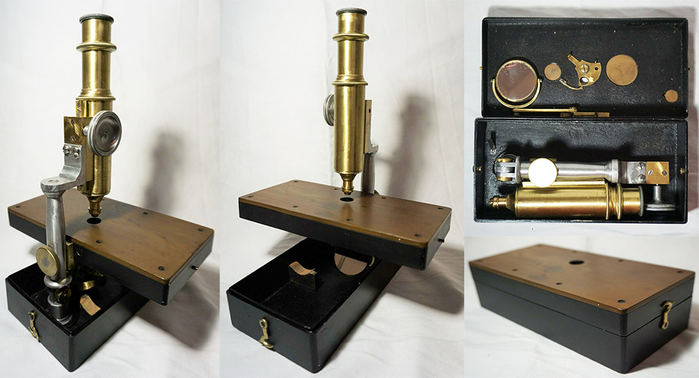 A Waechter Stand IV, serial number 5752, marked “Berlin”. The bodies of Stands IV and V are identical, the difference between the two being the optics that were supplied. This microscope was accompanied by objective lenses 1 and 2, which screw together to make objective 4, and objective lens 7 (see Figure 14). Microscopes with essentially identical bodies were also sold by F.W. Schieck and Schmidt & Haensch (both also from Berlin), although with distinctively different objective lenses, suggesting that the bodies may have been manufactured by a single maker, then outfitted with optics by each retailer..