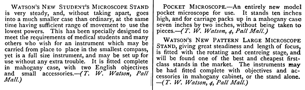 The earliest known information on Thomas Watson’s business, descriptions of three microscopes, published in the September 15, 1877 issue of “The London Medical Record”.