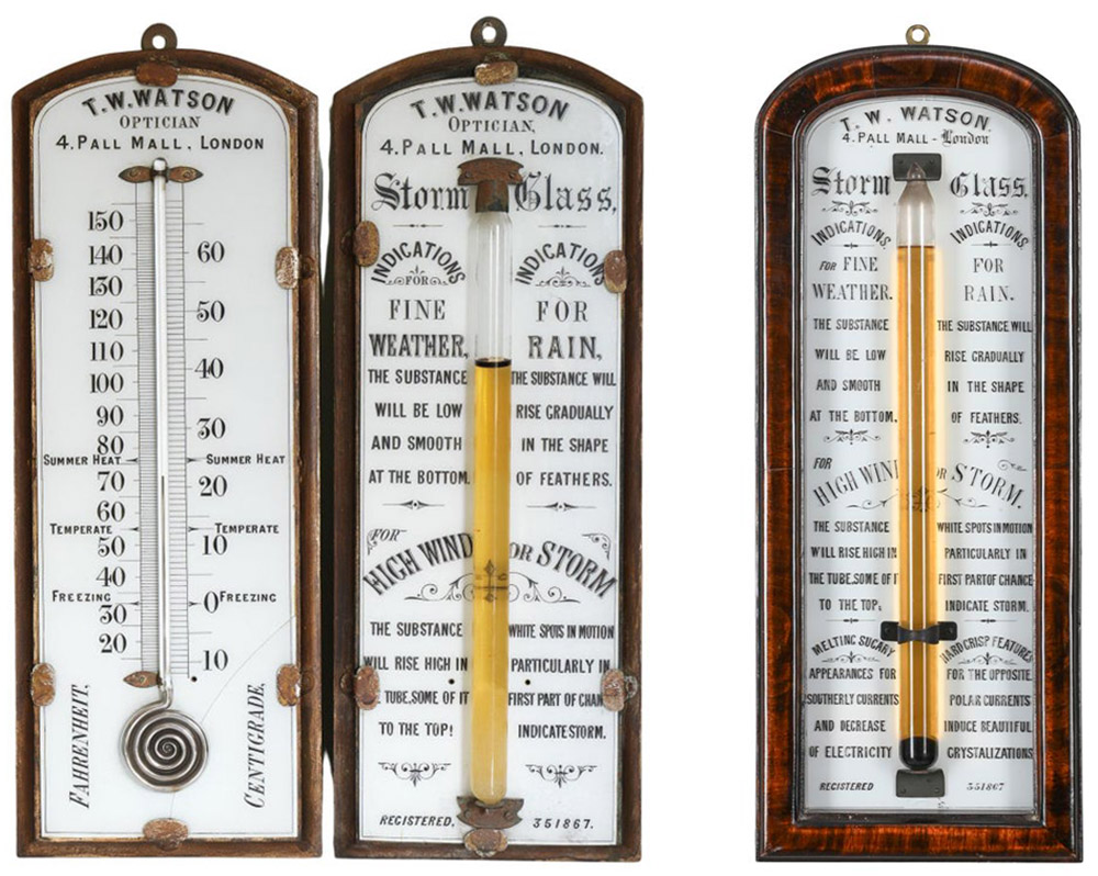 “Storm glasses” and a thermometer, sold by T.W. Watson. Images adapted for nonprofit, educational purposes from internet sale sites.