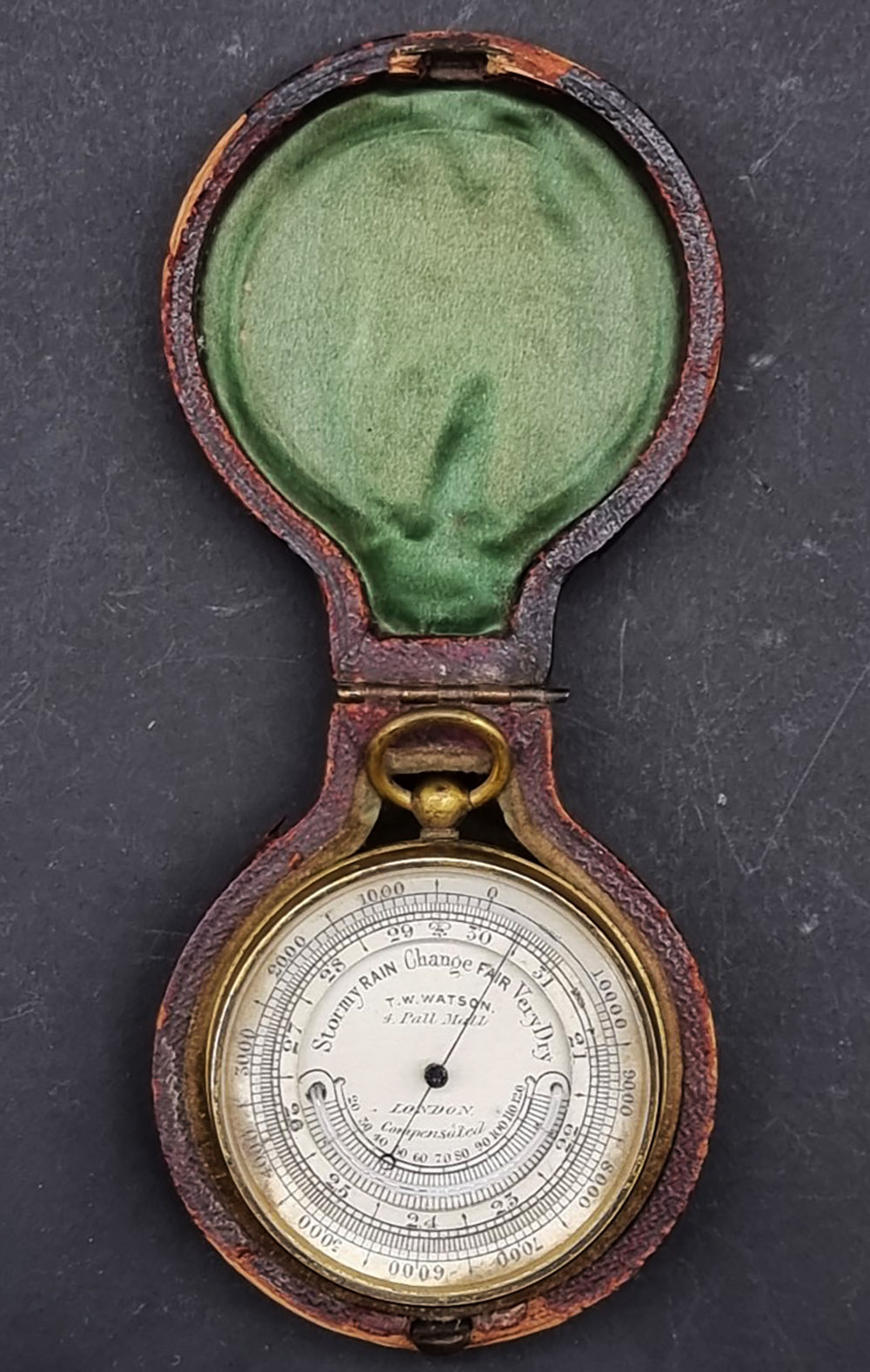 A pocket barometer that was retailed by T.W. Watson. Image adapted for nonprofit, educational purposes from an internet sale site.