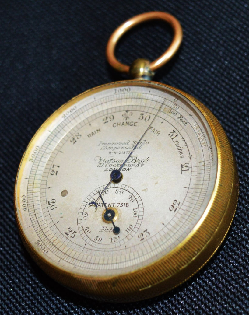 A pocket barometer by Watson Brothers, 31 Cockspur Street, ca. 1893-1898. Image adapted for nonprofit, educational purposes from an internet sale site.
