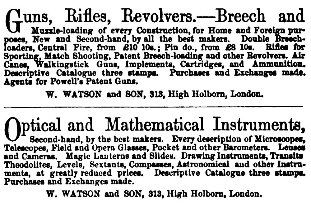 William Watson’s business started as a shop that sold a wide variety of goods, and he was described in trade directories and censuses as “general dealer”, “sale shop keeper”, “curiosity dealer”, and “miscellaneous dealer”. By 1864, it appears that William Watson’s inventory had become more focused, with the 1864 and 1866 baptism records of two children listing his occupation as “gun dealer”. His business became “W. Watson & Son” ca. 1867. Advertisements from 1869 listed both firearms and scientific instruments for sale (Figure 16). The guns were “new and second-hand” and the scientific instruments were “second-hand”, all “by the best makers”. From those statements, it can be concluded that W. Watson & Son did not at that time manufacture any of the items that they sold.