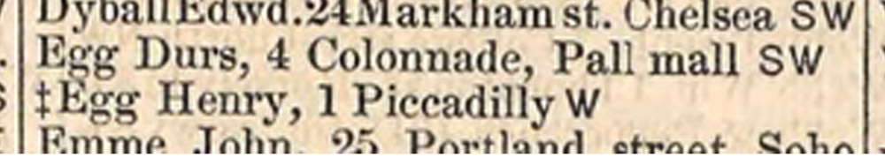 Post Office Directory of London (1865) “Egg Durs, 4 Colonnade, Pall mall SW”, page 1723