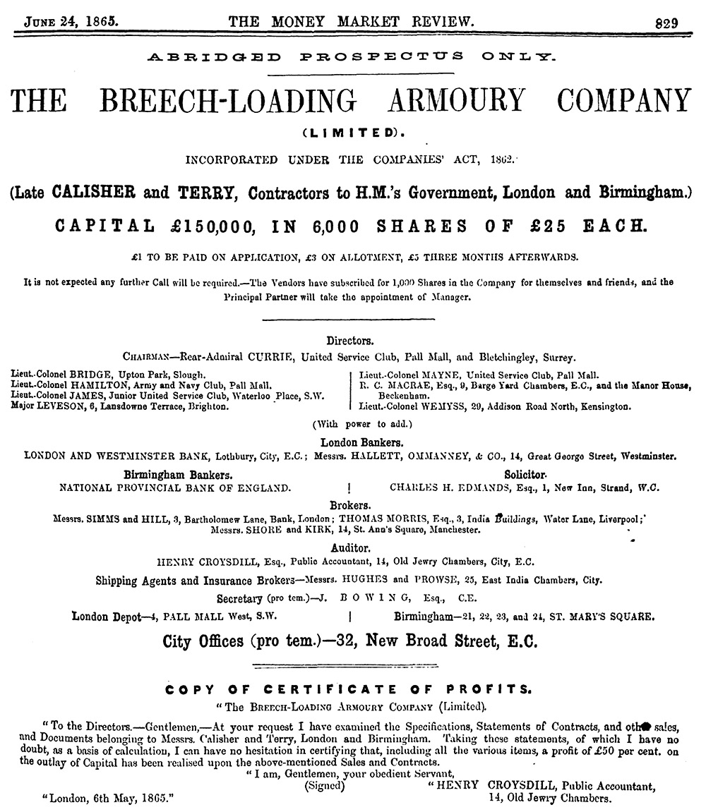 The Money Market Review (1865) Abridged prospectus of The Breech-Loading Armoury Company, page 829