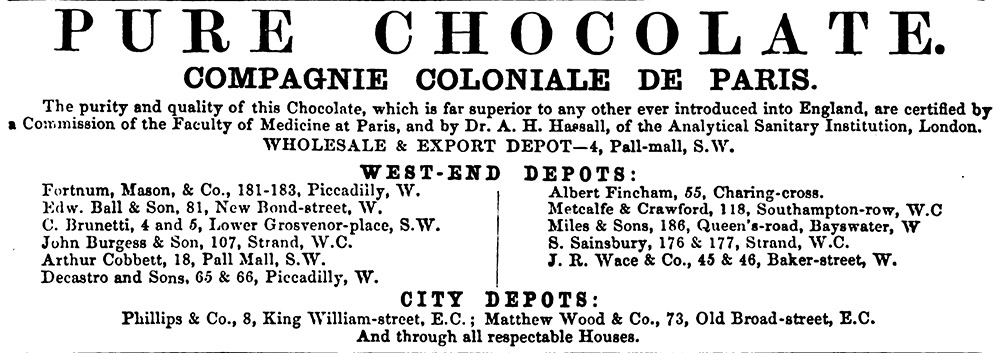 Post Office Directory of London (1870) “Pall Mall S.W. … 4 Compagnie Coloniale (de Paris) chocolate manufacturers”, page 473