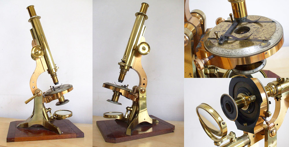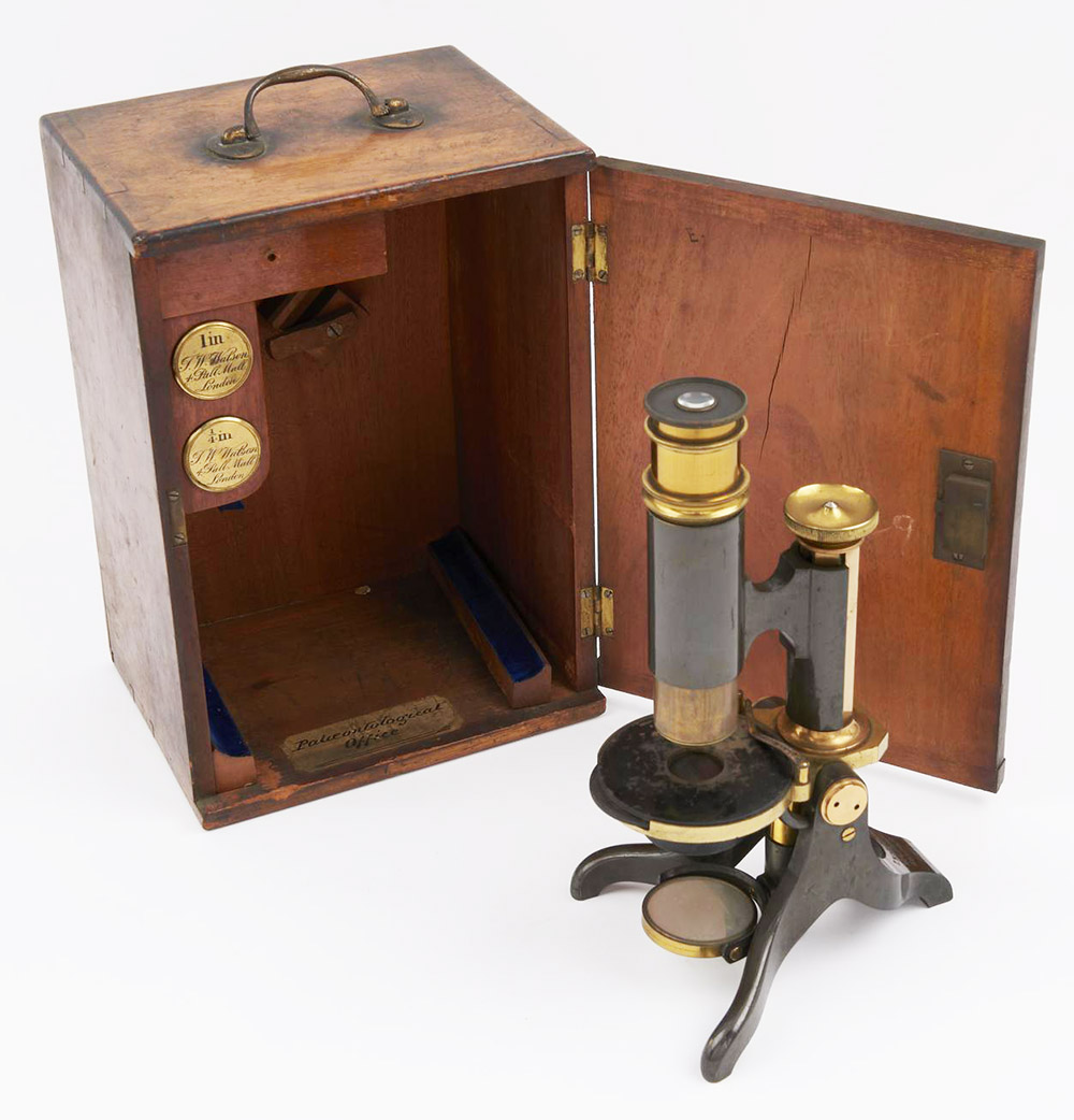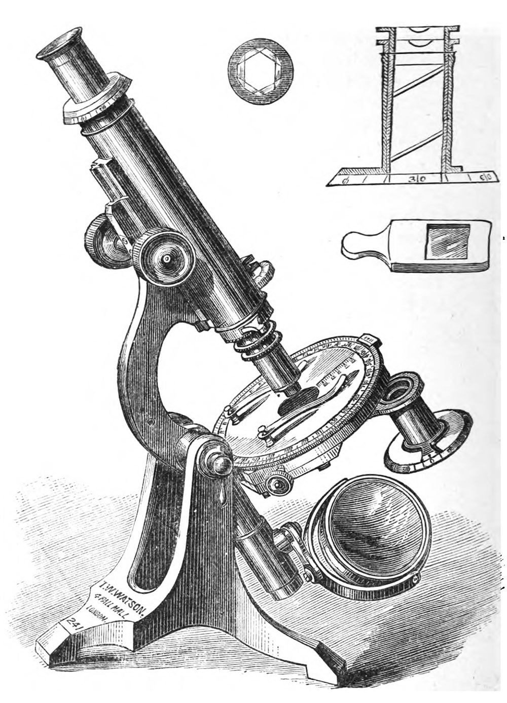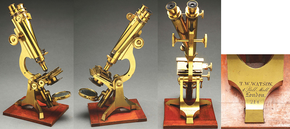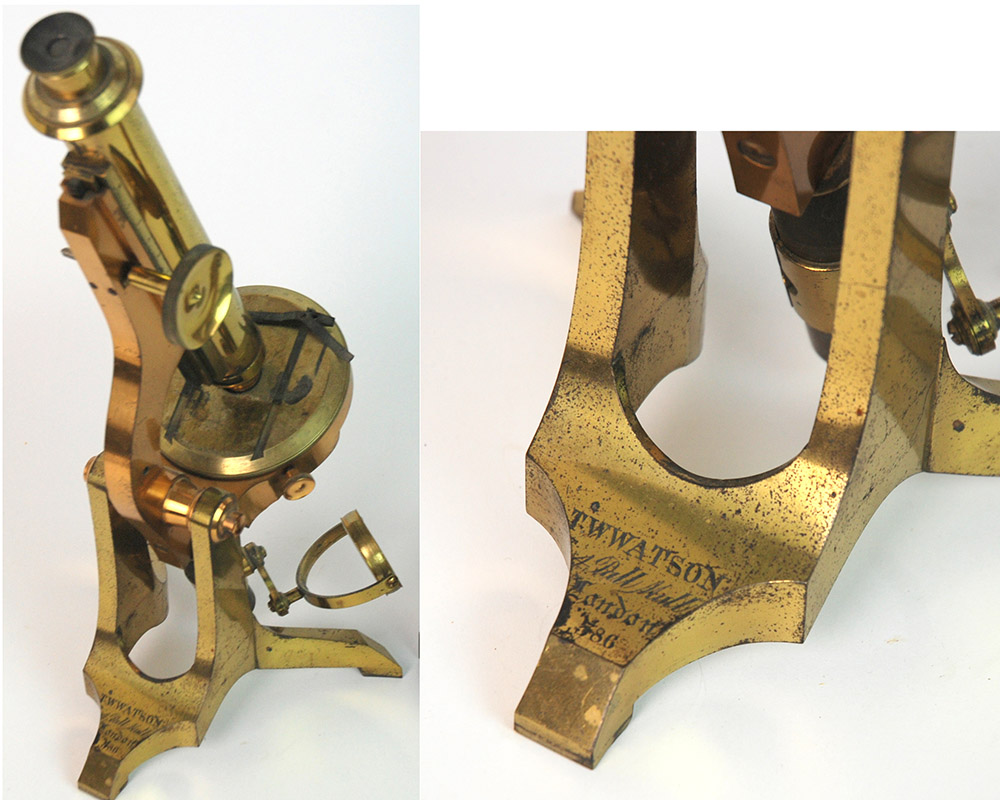 A Watson Brothers Rutley model microscope, serial number 5159. It is engraved with the address of 4 Pall Mall, thus dating it to between 1884 and ca. 1890. Images adapted for nonprofit, educational purposes from https://www.mineralogy.eu/optical/microscopes/Watson_5159.html
