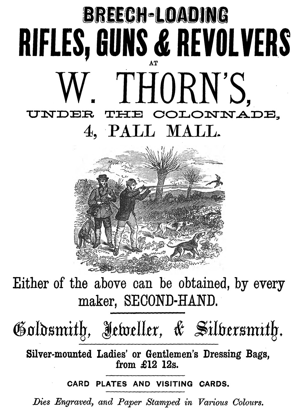 Post Office Directory of London (1875) “Thorn Wm. goldsmith, jeweller, silversmith, dressing case & bag maker & gun maker, 4 Pall mall SW”, page 1363