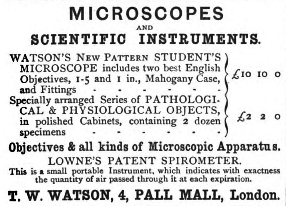 1869 advertisements from W. Watson & Son, with whom Thomas W. Watson worked as a “shopman”. Note that Watson sold new and used guns, microscopes, and other items that were produced by other manufacturers. From “The Lancet”.
