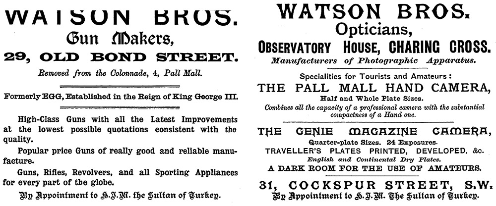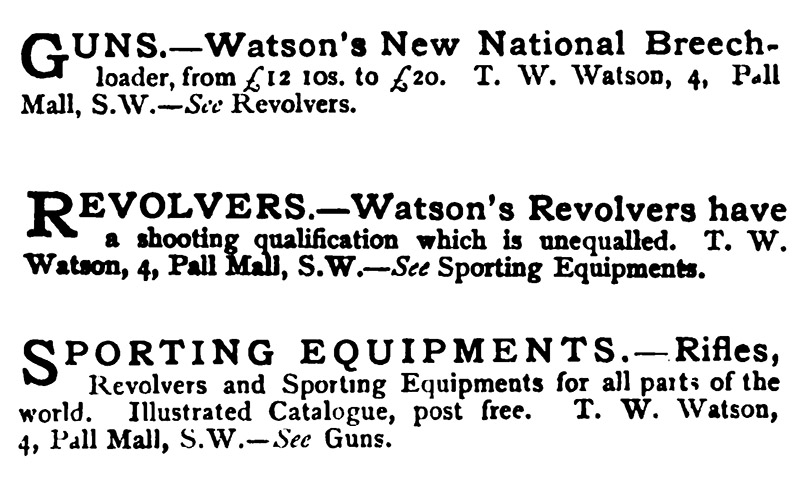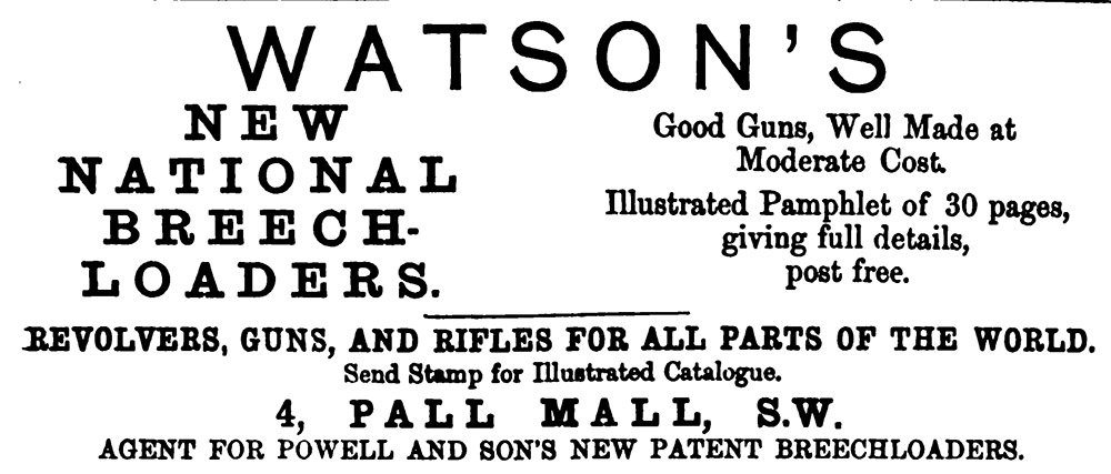 From Herbert Fry’s 1895 “London”. The firearm division had recently moved to 29 Old Bond Street. Note that the Watsons played up their (tenuous) connection to Durs Egg in this advertisement.