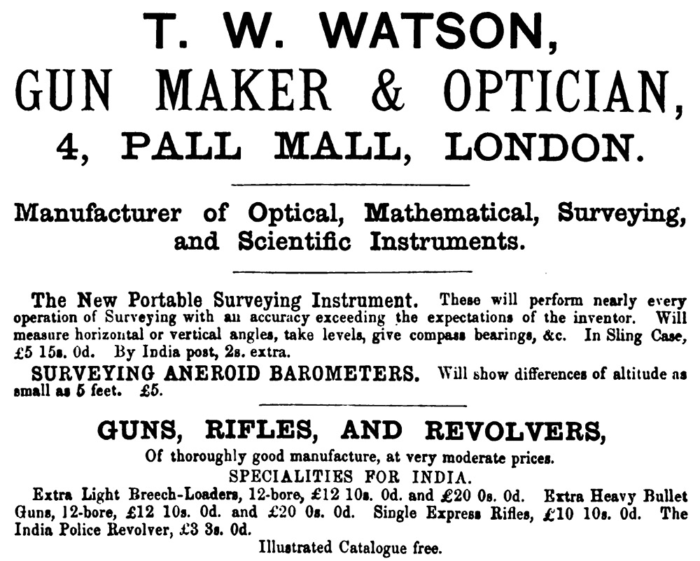 An 1878 advertisement for T.W. Watson’s firearms. From “Allen's Indian Mail and Official Gazette”.