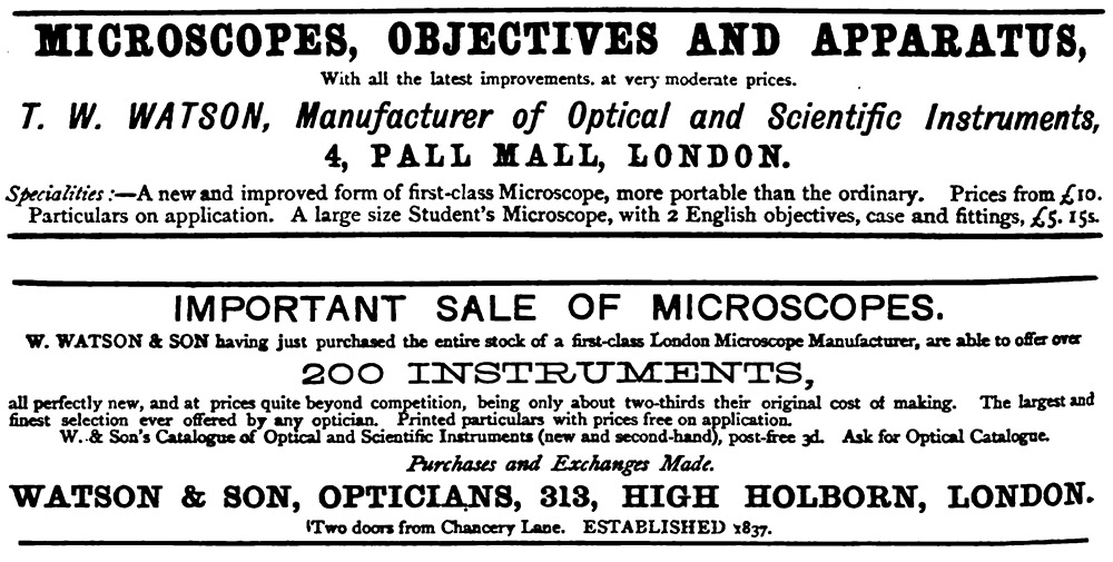 Two 1878 advertisements for microscopes, from T.W. Watson and from Watson & Son, noting that Thomas advertised instruments of his own manufacture, while his Uncle William was still selling microscopes that were produced by other makers. Both from “Hardwicke’s Science-Gossip”.