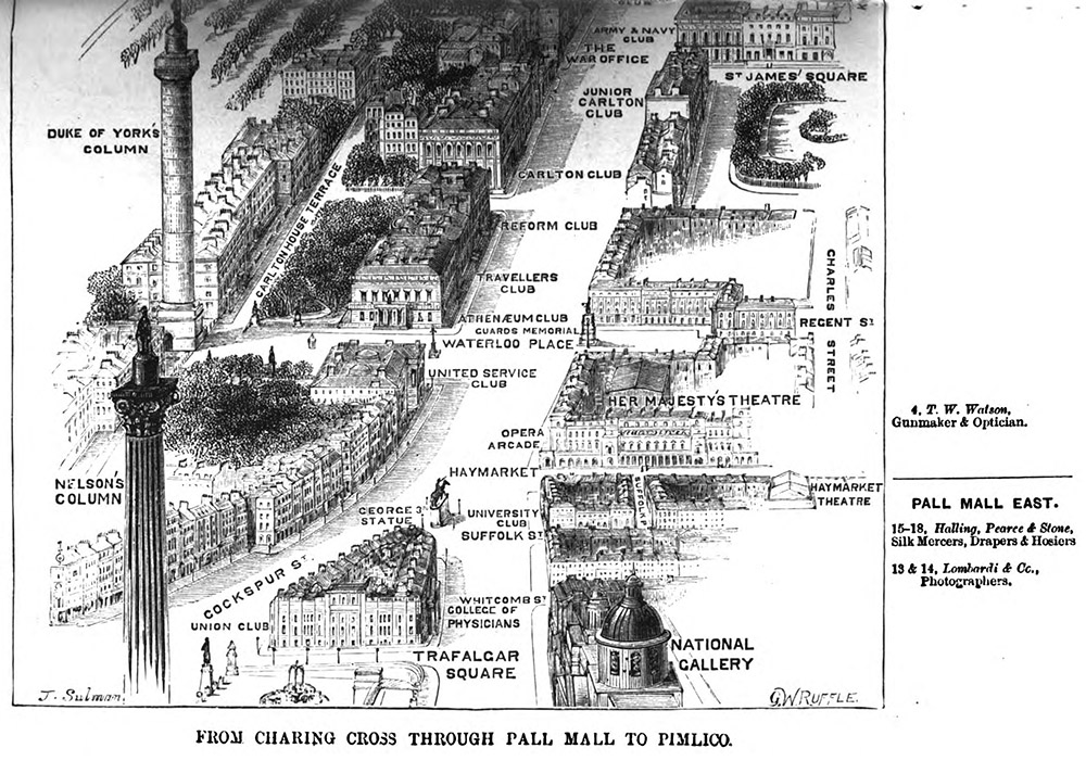 The shop of “T.W. Watson, Gunsmith & Optician” was marked on a map of Pall Mall in Fry’s “London in 1880, Illustrated with Bird's Eye Views of the Principal Streets”. Watson undoubtedly paid for this highlight, as very few other businesses are noted on the maps.