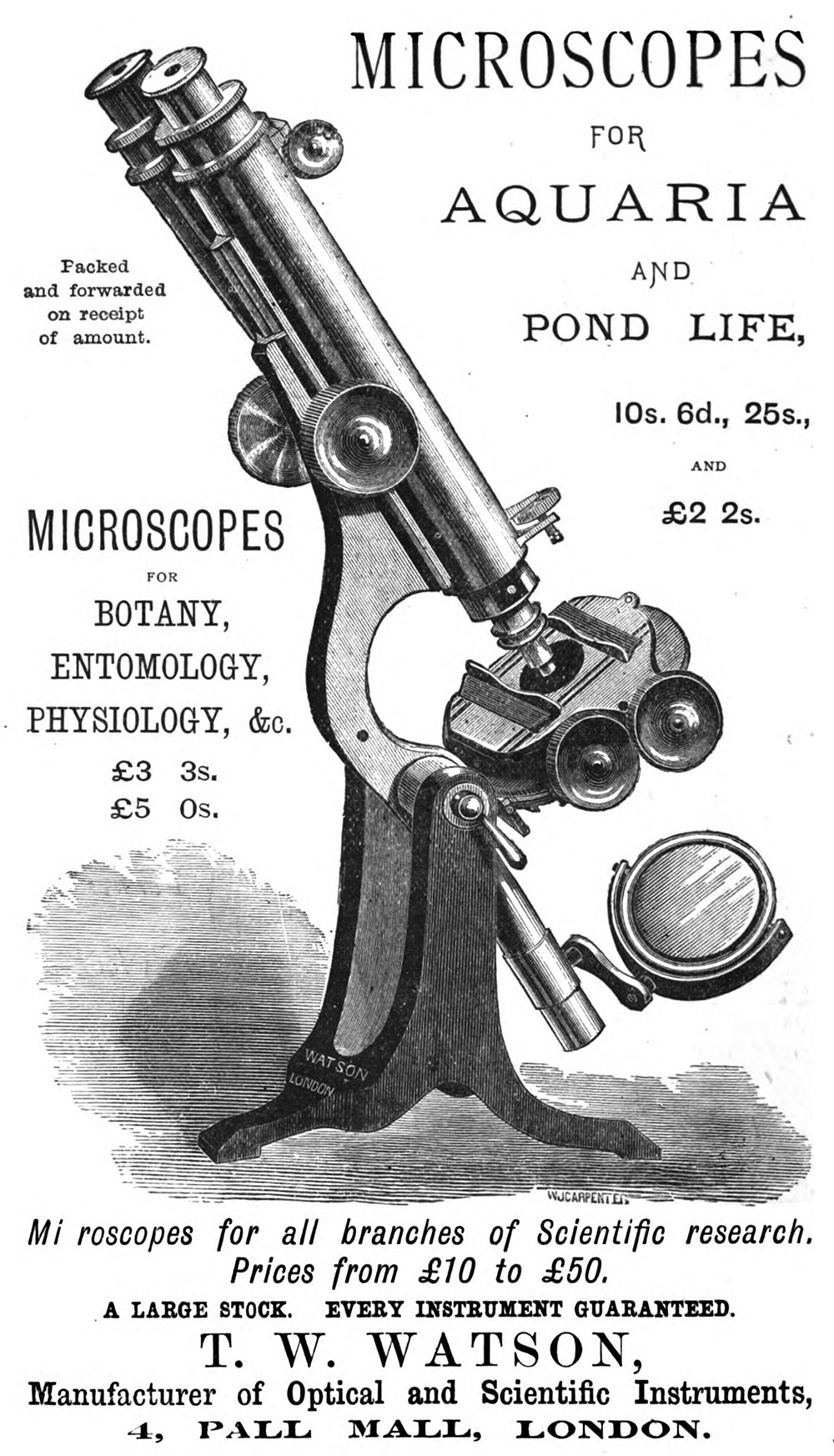An advertisement from Taylor’s 1881 “The Aquarium; its Inhabitants, Structure and Management”. The illustrated microscope is the same model as shown in Figure 2, above, and is presumably Watson’s “New Pattern Large Microscope”.