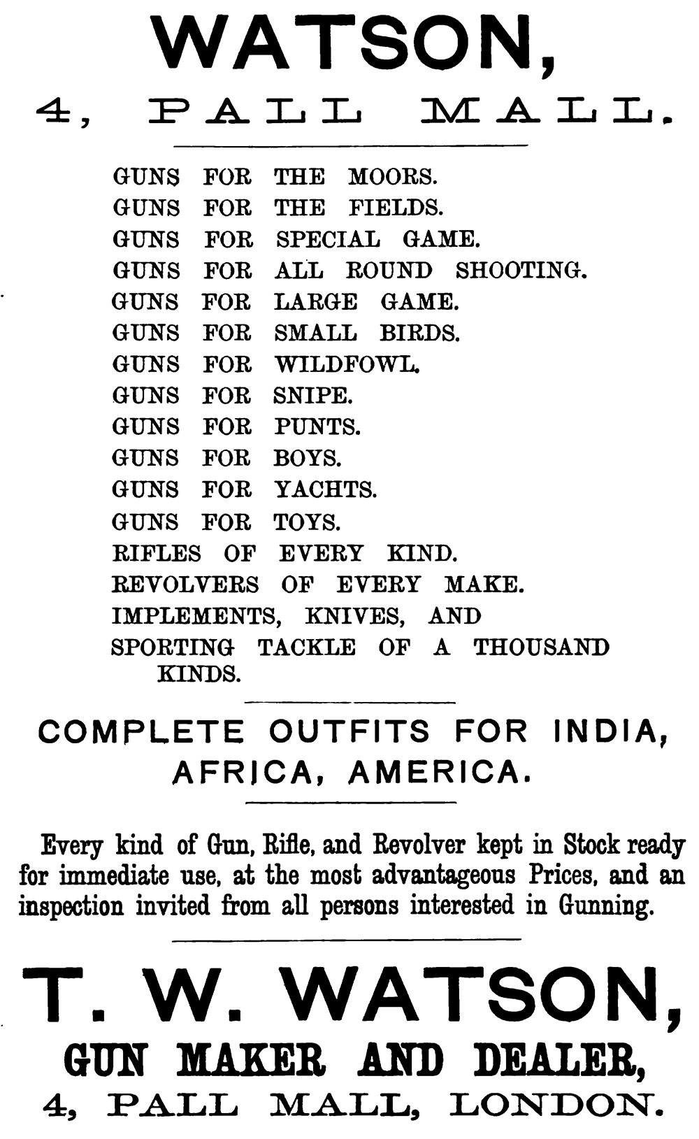 An 1882 advertisement for T.W. Watson’s guns, from J.H. Walsh’s “The Modern Sportsman's Gun and Rifle, volume 1”.