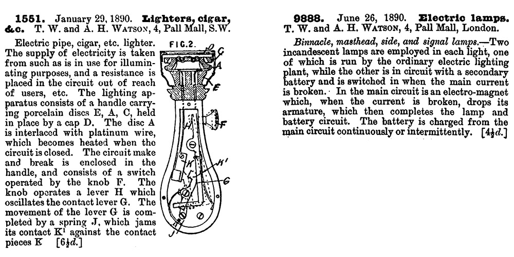 The Illustrated Official Journal (Patents) (1890) Patents by T.W. and A.H. Watson, pages 164 and 1102