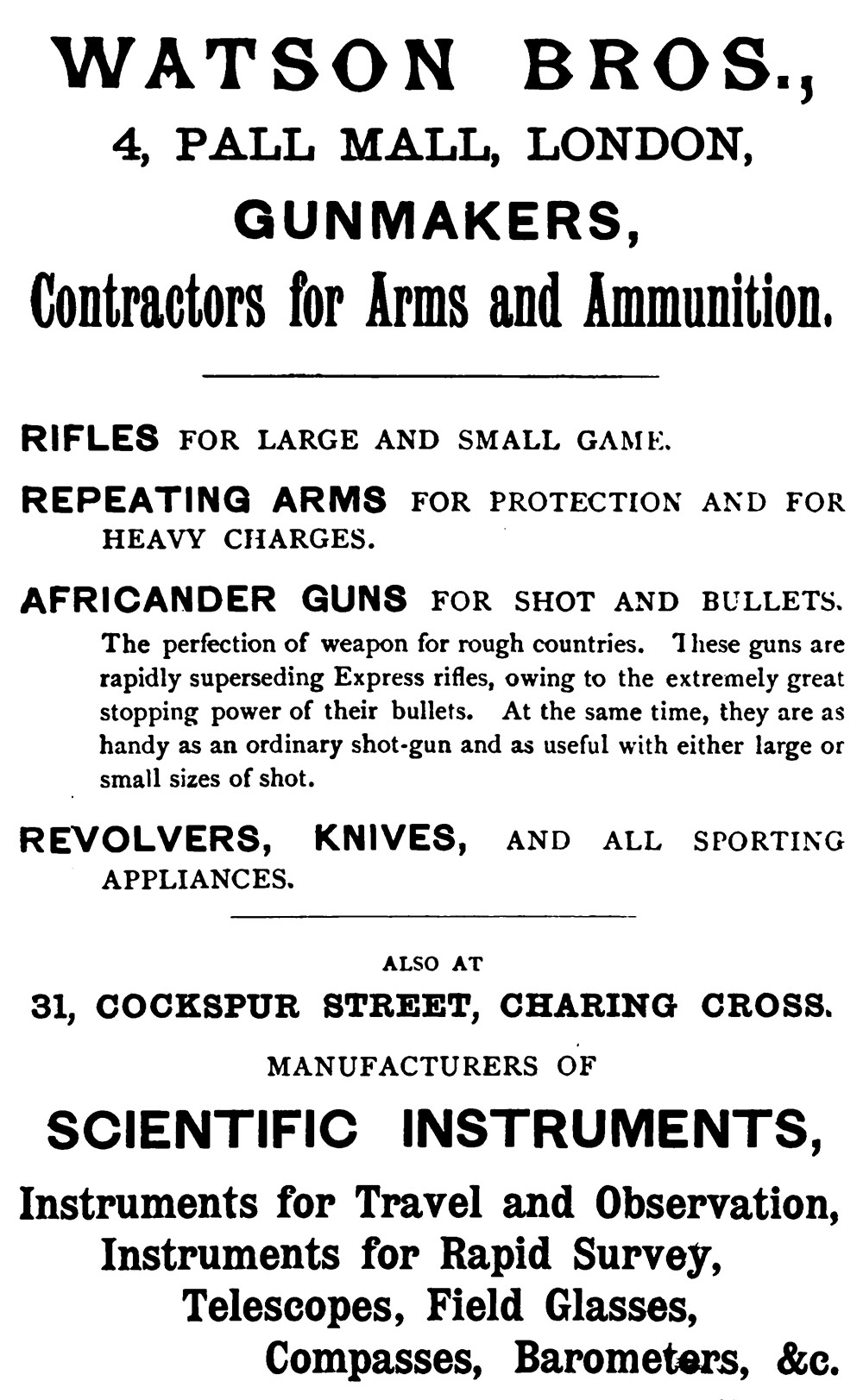 An 1893 advertisement, noting that Watson Brothers had moved their scientific division to 31 Cockspur Street. From T.H. Parke’s “Guide to Health in Africa with Notes on the Country and Its Inhabitants”.