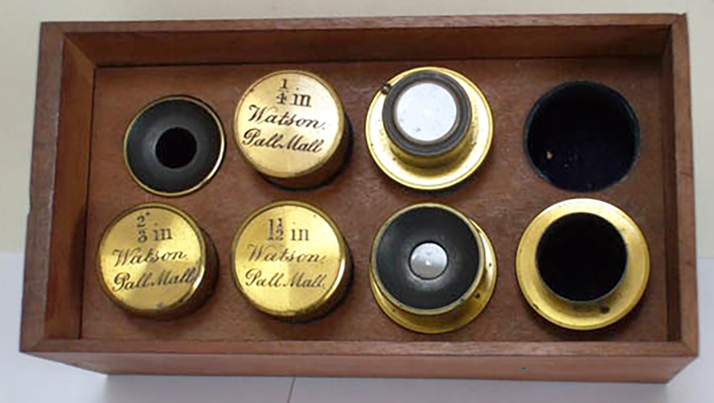 Microscope objective lens canisters signed by T.W. Watson. Image adapted for nonprofit, educational purposes from https://www.mineralogy.eu/optical/microscopes/Watson_5159.html