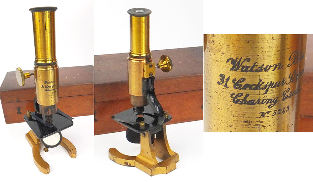 Watson Brothers moved their scientific products business to 31 Cockspur Street, Charing Cross, around 1893, then closed it in 1898. This microscope, with serial number 5243, was imported from a French maker, and is more of a cheap toy than a serious optical instrument. Images adapted for nonprofit, educational purposes from an internet sale site.