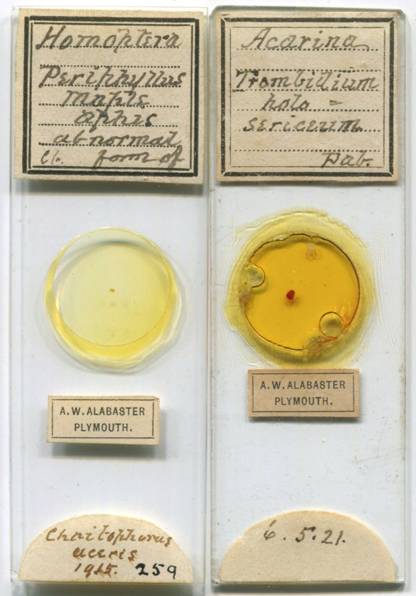Alfred Alabaster took up microscopy as a hobby quite late in life, apparently an activity to occupy his retirement years. He was 77 years old when he joined the Quekett Microscopical Club in 1917. He remained a member for about ten years. The microscope slides shown in Figure 1 are dated 1915 and 1921. The only known records of Alabaster’s involvement in microcopy are his membership in the QMC, and his rarely-seen slides.