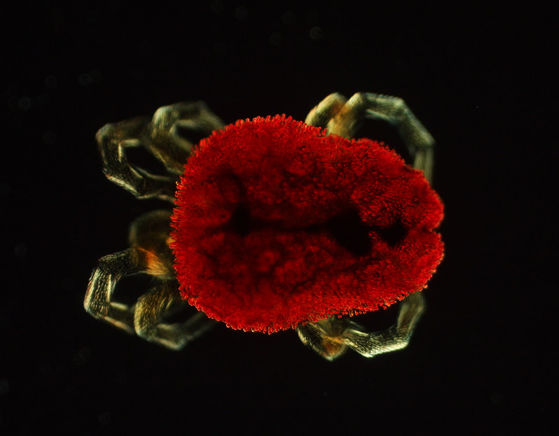 The specimen from the right slide in Figure 1 (Trombidium holosericeum, the red velvet mite), viewed through a 3.4x objective lens, with crossed polarizing filters.
