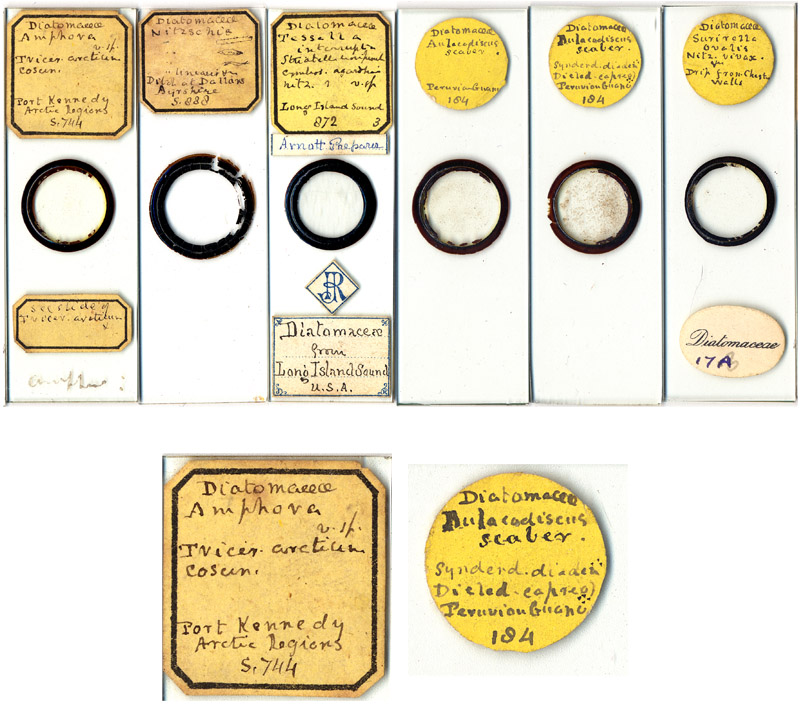 George A. Walker-Arnott was Professor of Botany at the University of Glasgow, Scotland, during the mid-1800s, and made numerous significant contributions to that field. Toward the end of his life, he focused his energies on studying diatoms. Arnott left behind his imprint in the naming of countless species of plants and diatoms, and specimens of both plants and diatoms that can still be found in museums throughout the world. The National Botanic Garden of Belgium currently holds about 2000 tubes of Arnott’s diatom gatherings. The Royal Botanic Garden of Edinburgh also holds an extensive collection of Arnott’s diatom slides and gatherings. Julien Deby reported in 1891 that his collection contained 1100 diatom slides that had been prepared by Arnott, plus 300 tubes of unmounted, cleaned material. Thomas Rylands and Robert Greville also acquired many of Arnott’s microscope slides. Deby’s, Rylands’ and Greville’s collections, including their Arnott slides, were later acquired by the British Museum. Other early diatom biologists, such as Arthur S. Donkin, also wrote of owning slides by Arnott. Thomas Curties donated 50 diatom slides, including several mounted by Arnott, to the Quekett Microscopical Club in 1871. Doubtless, many other friends and colleagues acquired slides made by Arnott, which have since found their ways into the cabinets of diatom biologists and slide collectors (Figure 1).