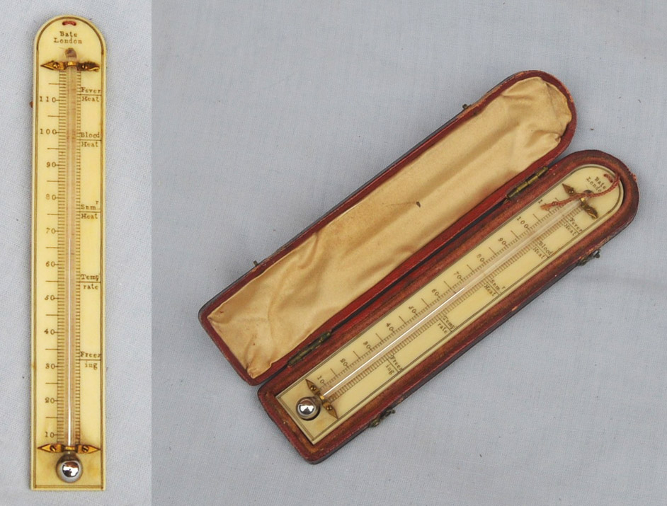 A cased thermometer by R.B. Bate. Adapted for nonprofit, educational purposes from an internet sale site.