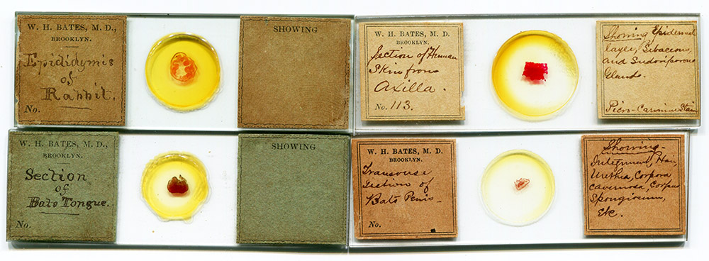 Microscope slides by William H. Bates, probably dating from around 1881-81, when he advertised to exchange histological and pathological slides (see Figure 2). Bates stained and sectioned a variety of tissues from humans and other animals, including unusual material such as the penis of a bat (Figure 3).
