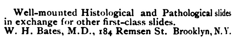 Journal of the New-York Microscopical Society (1889) Members, “1882, Bates, William H., M.D., 175 Remsen Street, Brooklyn, N.Y.”