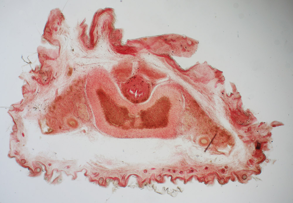 “Transverse section of bat’s penis”, prepared ca. 1881 by W.H. Bates (see Figure 1). Imaged with a 3.5x objective lens and C-mounted digital SLR camera on a Leitz Ortholux II microscope.
