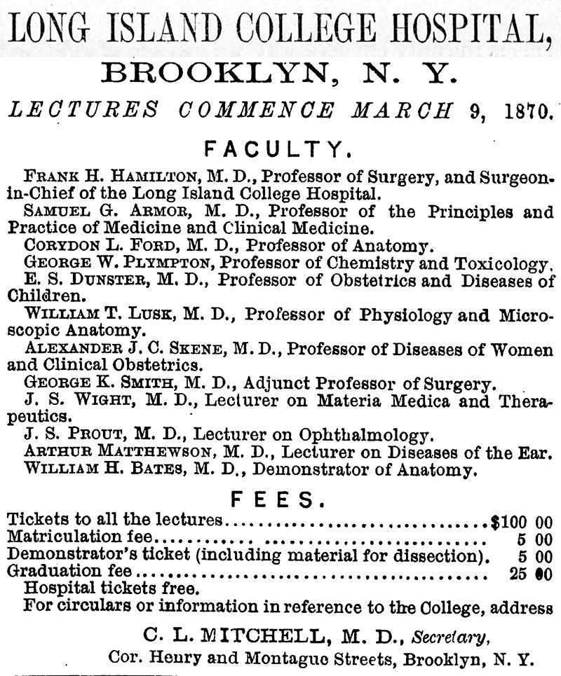 William H. Bates served as a demonstrator of anatomy at Long Island College Hospital from 1867-1874. Advertisement from “The Physican and Pharmacist”, 1870.