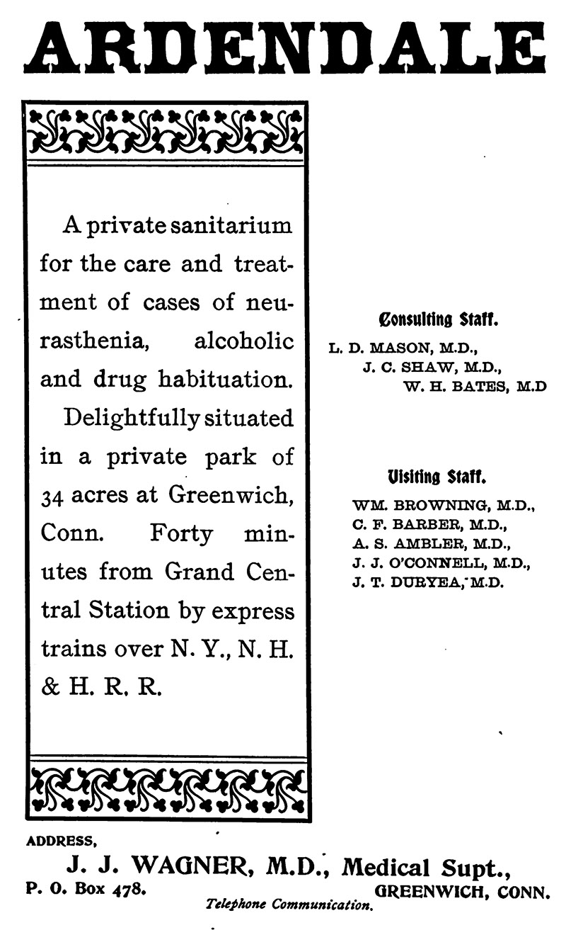 William H. Bates served on the staff of Ardendale sanitorium, “a strictly ethical institution where patients of the better class could receive the benefit of the best care and treatment and experience of men well known in this line of work”. Advertisement from “The Quarterly Journal of Inebriety”, 1902.