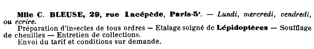 The 1930 Bulletin de la Société Entomologique de France listed Clémence as "Mlle C. Bleuse", and that year's Annuaire du Commerce Didot-Bottin listed "Bleuse (C.), préparations microscopiques" at 29 Rue Lacépède.
